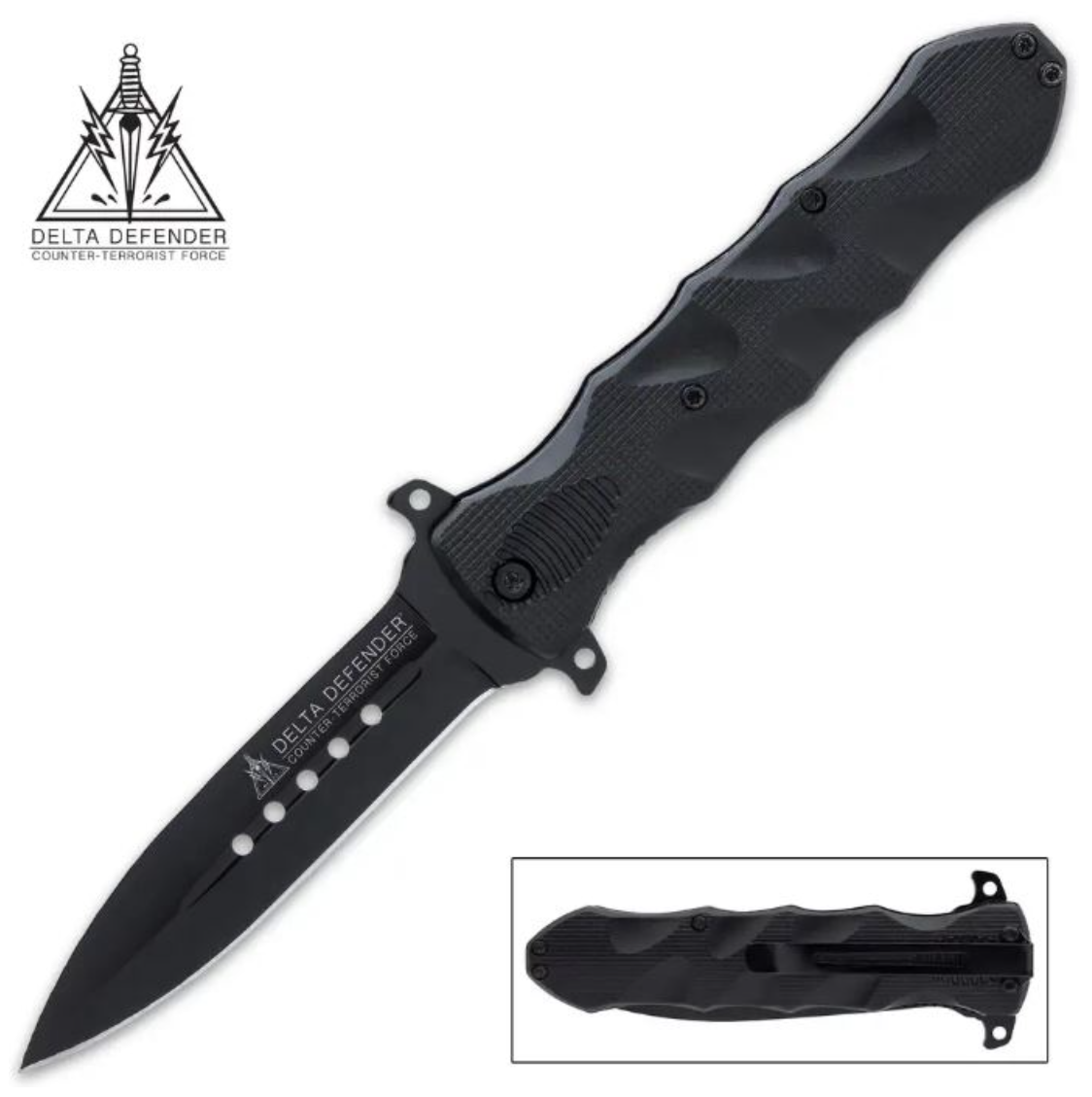 The Delta Defender Black Stiletto Knife has an all-black, non-reflective appearance perfect for covert ops
