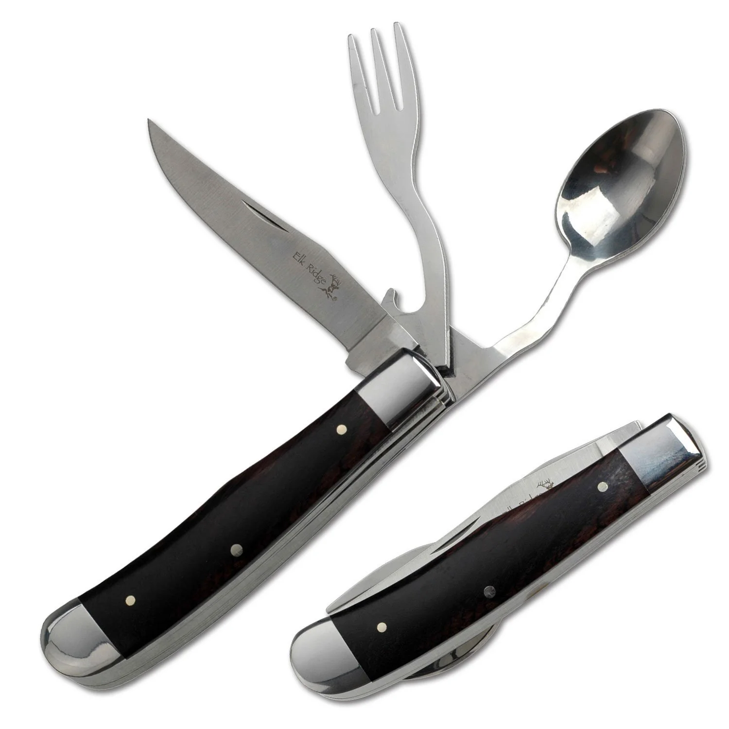 SPECIAL FEATURES: Multi-Function Pocket Knife, Fork, Spoon and Bottle Opener, Brown Wood Handle. Wood Handle Can Be Disassembled and Reassembled Into a Pocket Knife Without the Additional Utensils if Desired.